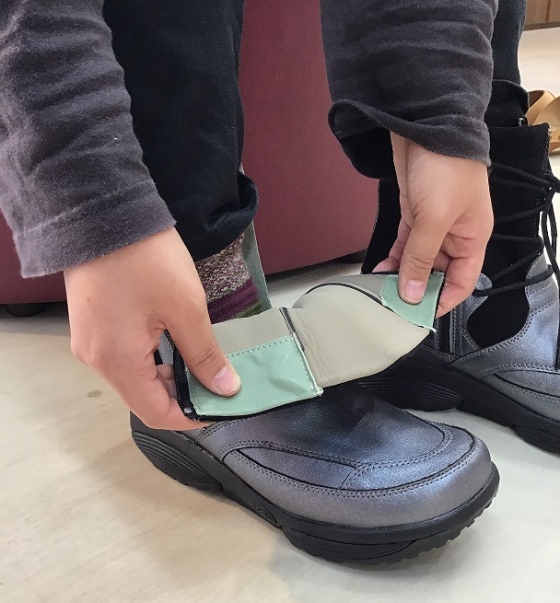 ベルト部分はマジックテープになっていて、甲の高さに合わせて調節ができ、脱ぎ履きも簡単です。
